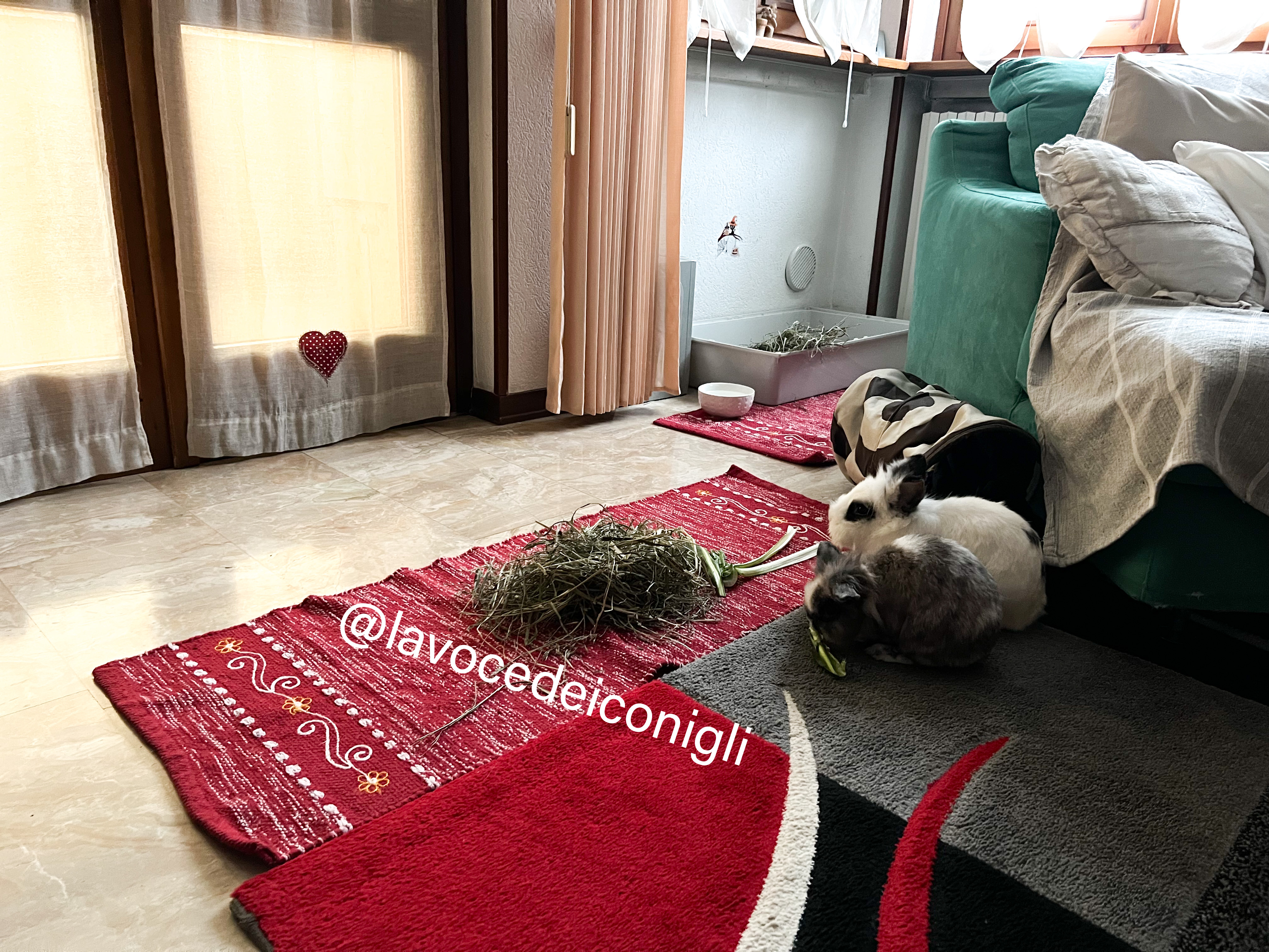 Tappeti: Il coniglio ha bisogno di correre e saltare, il movimento oltre a renderlo felice è un vero allenamento psicofisico! Necessita quindi di spazi in casa e un bel tappeto su cui fare "grip"! Vedrete cosi il vostro coniglio fare vere piroette, apprezzano molto anche divani e letti! E' importante mettere un bel tappeto in cui il coniglio possa muoversi e correre senza scivolare.